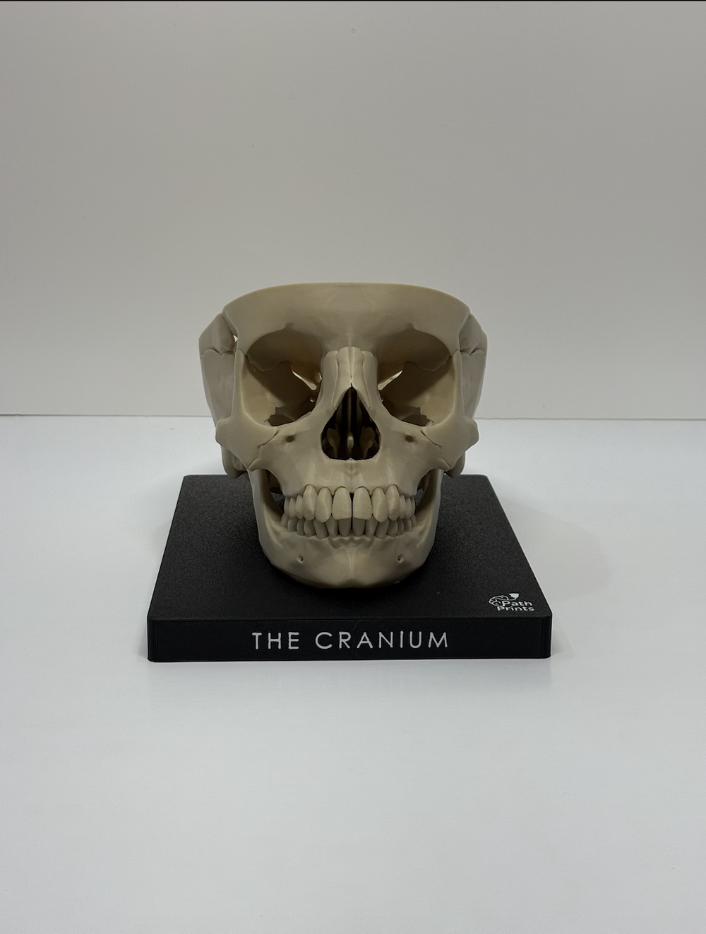 A precise, life-size 3D printed skull for learning, teaching, and display — made by PathPrints.